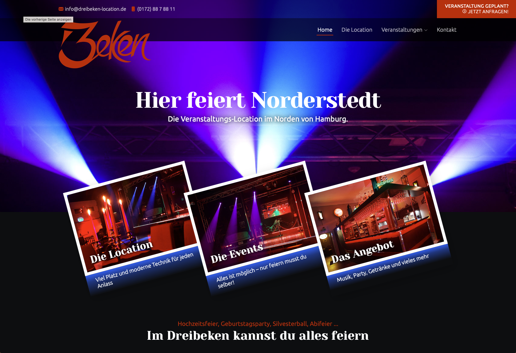Nachdem der Betreiber der Norderstedter Party-Location Dreibeken sein Konzept geändert hat und seine Räumlichkeiten auch für Hochzeiten, Weihnachtsfeiern und andere Events öffnen möchte, musste natürlich auch die Website entsprechend angepasst werden. Ein Job für Kausche und Partner! Aus dem bunten One-Pager haben wir eine nicht weniger bunte Website gemacht, die jetzt auch bei Google gefunden wird. Dazu haben wir alles komplett neu programmiert und dabei von Anfang an inhaltlich und formal auf eine logische Struktur geachtet. Das klingt zwar umständlich, ist aber meistens nicht mehr Aufwand als der Umbau einer Website auf Basis des bestehenden Systems – und bringt schon kurzfristig bessere Ergebnisse!