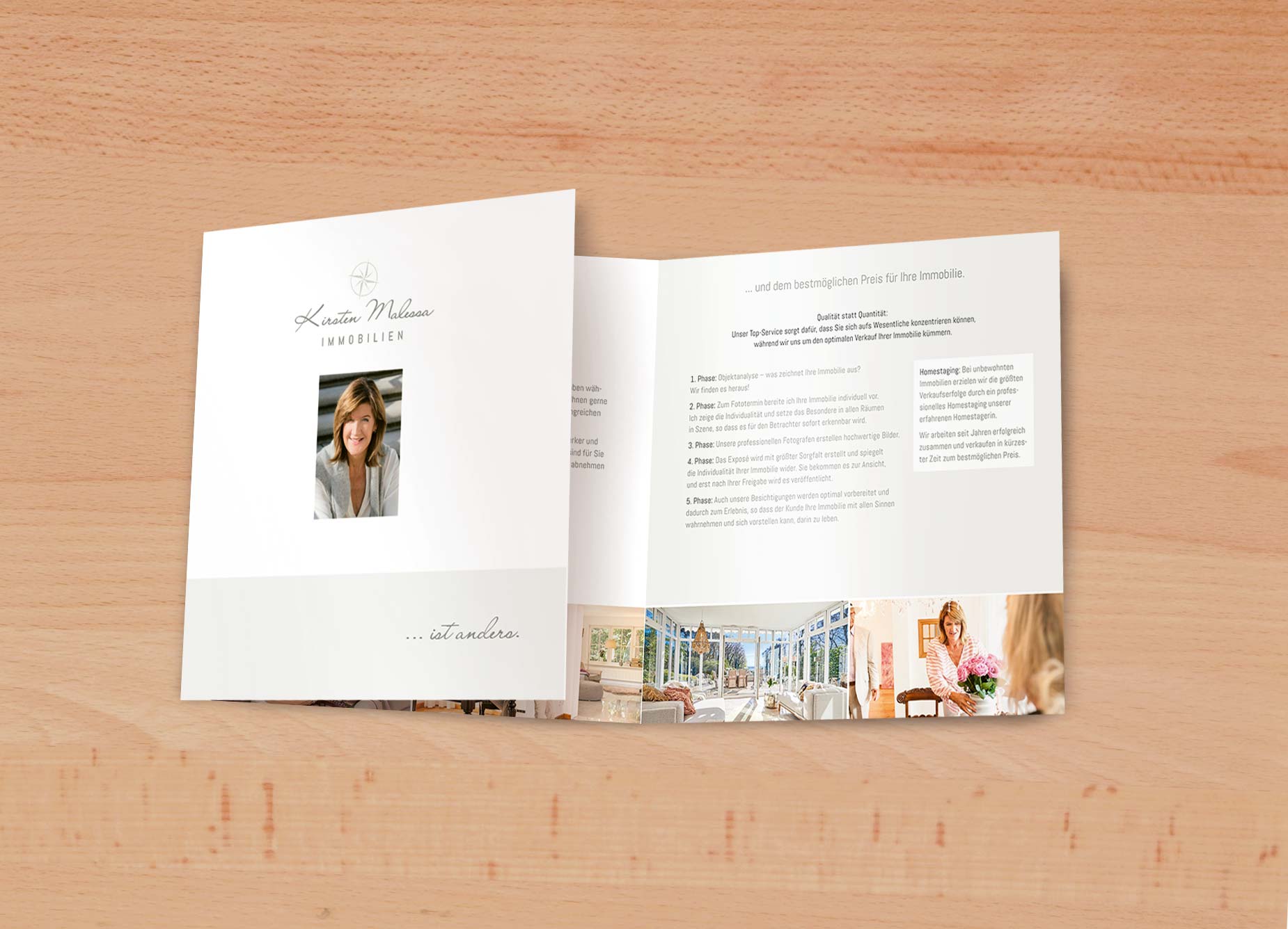 Kirsten Malessa ist eine Immobilienmaklerin, die vieles anders macht als ihre Mitbewerber. Das, was sie auszeichnet – und ihren Kunden tatsächlich einen großen Mehrwert bietet – haben wir in einer kleinen Broschüre dargestellt. Und – Überraschung! – auch diese ist edel, schlicht und ... irgendwie anders!