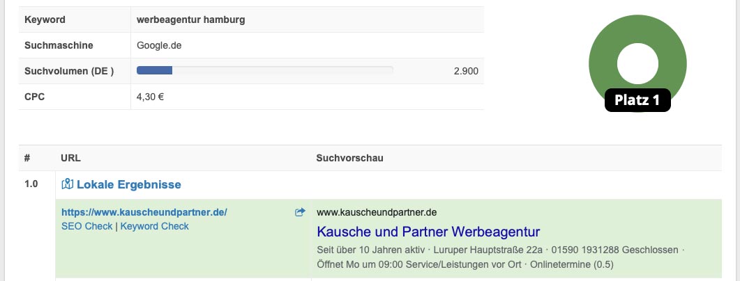 Wer anderen zeigen möchte, wie man seine Website bei Google ganz nach vorne bringt, der sollte das auch am Beispiel seiner eigenen Website vorführen können. Gesagt, getan: Unter mehr als 1.500 Werbeagenturen im Raum Hamburg ist Kausche und Partner diejenige, die von Google an erster Stelle angezeigt wird. Und zwar nicht bei ganz speziellen Suchphrasen, sondern dann, wenn ganz allgemein nach "Werbeagentur Hamburg" gesucht wird.