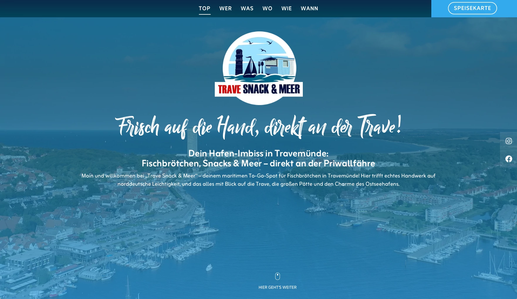 Direkt an der Bootstankstelle am Travemünder Priwallufer gibt es leckere Fischbrötchen, Snacks, Getränke und sonstigen Proviant für Spaziergänger und Seeleute. Damit man seinen Zwischenstopp rechtzeitig planen kann, haben wir für "Trave, Snack & Meer" eine Website gebaut, die nicht nur beschreibt, wo der Kiosk liegt, sondrn auch, was den Besucher dort erwartet. Und das ist wirklich lecker – einfach mal ausprobieren!